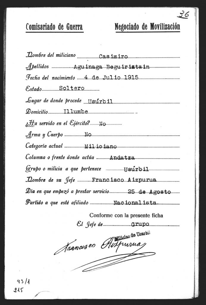 Andatzan borrokan aritu zen 1936/08/25etik aurrera (F. Aizpurua buru). Frankistek herrira sartzea lortu zutenean atxilo hartu zituzten zenbait herritar. Tartean Kasimiroren laguna zen Jose Mari Furundarena Begiristain aginagarra, gerora fusilatuko zutena. Horren jakitun, herritik ospa egitea erabaki zuen familiari nora zihoan esan gabe.