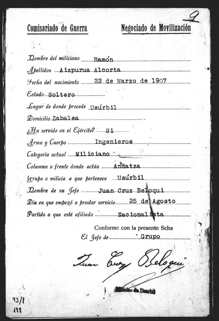 Usurbilen jaioa 1907/03/22an. San Esteban-Urdaiagako Zabalea baserriko semea. Ezkongabea, nazionalista eta 1936/08/25tik aurrera Usurbilgo Gerra komisaldegiko 1. Eskuadrako milizianoa (J.K. Beloki buru).