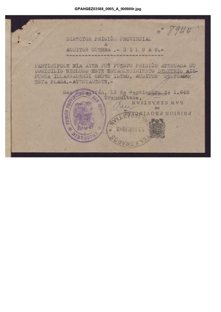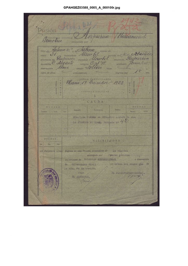 Usurbilen jaioa 1923/12/19an. Zubietarra. 1942/02/16ean atxilotu eta Donostiko kartzelera eraman zuten, inkomunikazio egoeran. Angel Aliri Añorgaren espediente berean txertatu zuten eta hilabete luzez eduki zuten atxilo, baina ez zuen Gerra Kontseilurik pairatu. 1942/09/12an aske geratu zen.
