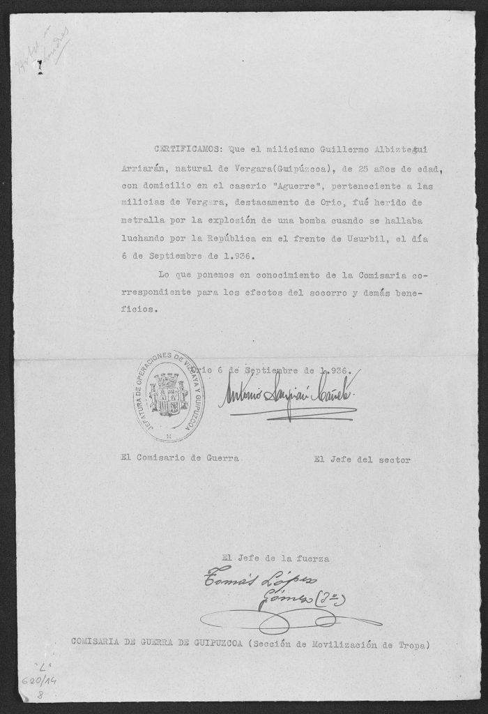 1937/05/02an hil zen, Bilbon, frentean borrokan zauritua izan ostean.