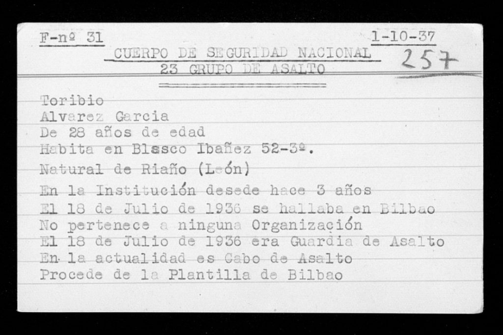 Riañon (Leon) jaioa. 28 urte zituen 1937an. Bilboko “Guardia de Asalto”ko kidea zen.