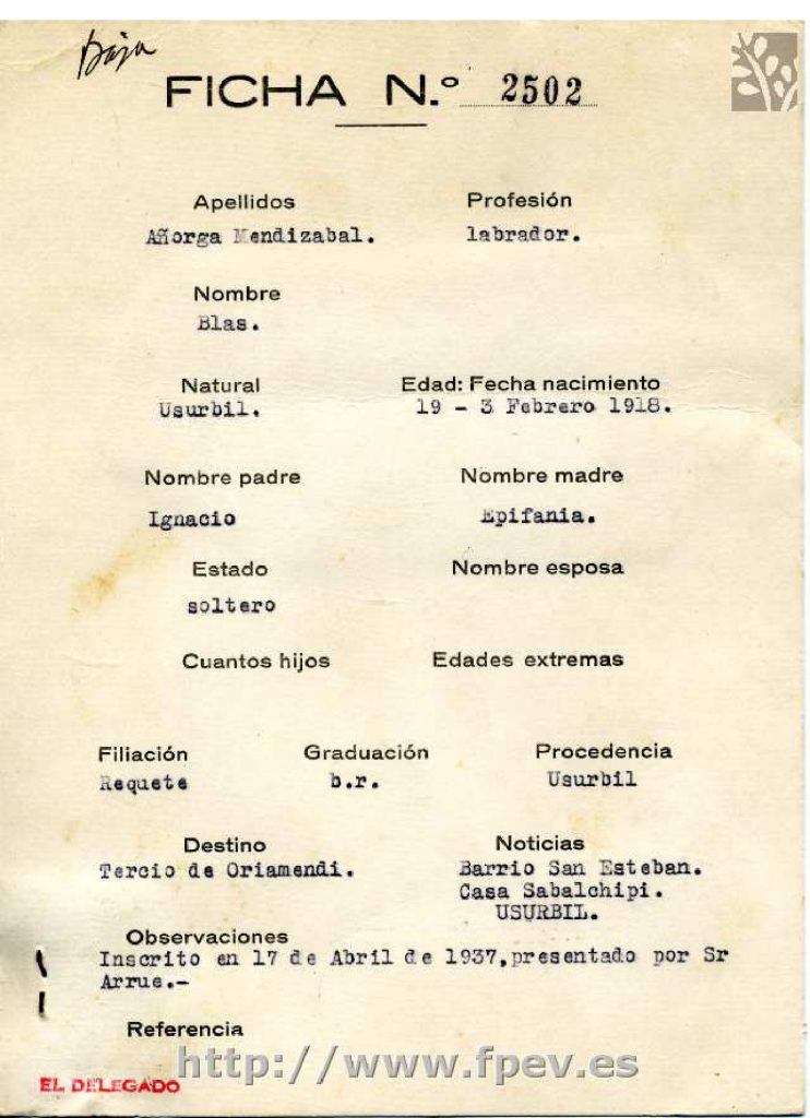 *Usurbilen jaiotakoa 1918/02/03an, Txokoaldeko ‘Saltxipi’ baserrikoa. 1937/04/17an erreketeen Oriamendiko Tertzioan izena eman zuen, Jose Inazio Arruek aurkeztu zuela. Frankisten ‘Movimiento Nacional’ delakoaren kidea izan zen diktaduran.