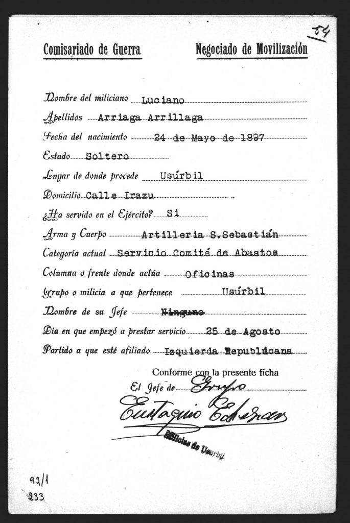 Usurbilen jaioa 1897/05/24an, Irazu kalean bizi zen. Ezkongabea, [AR/IR]-ko Usurbilgo presidentea eta Hornikuntza komitean, ofizina lanetan aritu zen 1936/08/25tik aurrera. MAOC-1 Larrañaga Batailoian egon zen borrokan, urrian.  1936ko abenduaren 2. hamabostaldian eta 1937ko martxoaren 2. hamabostaldian MAOC-2 Gipuzkoan borrokan 1. konpainiako soldadu gisa azaltzen da (28.052 zkia.) JSU-ko kidea 1937/01/12ean.