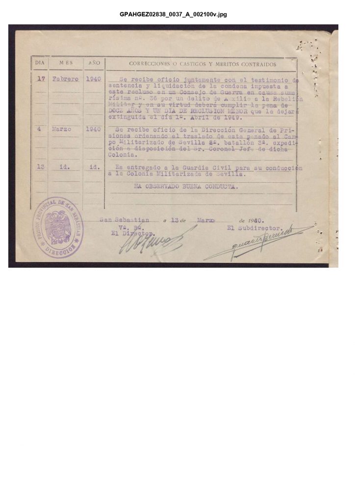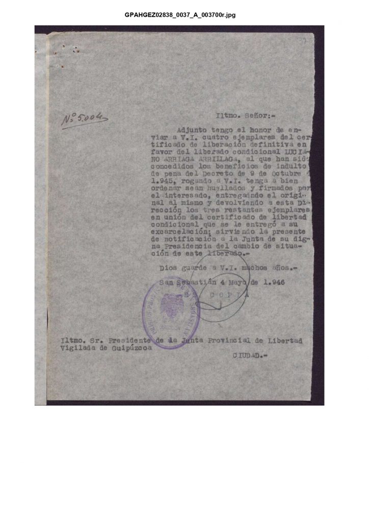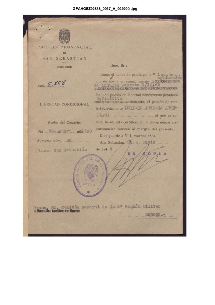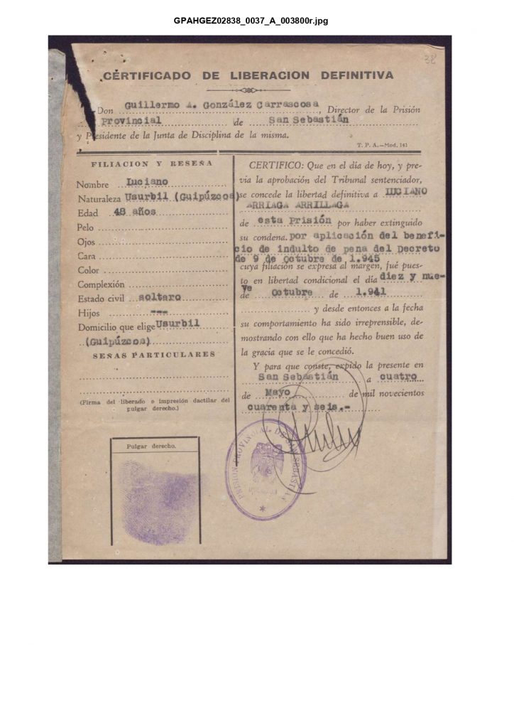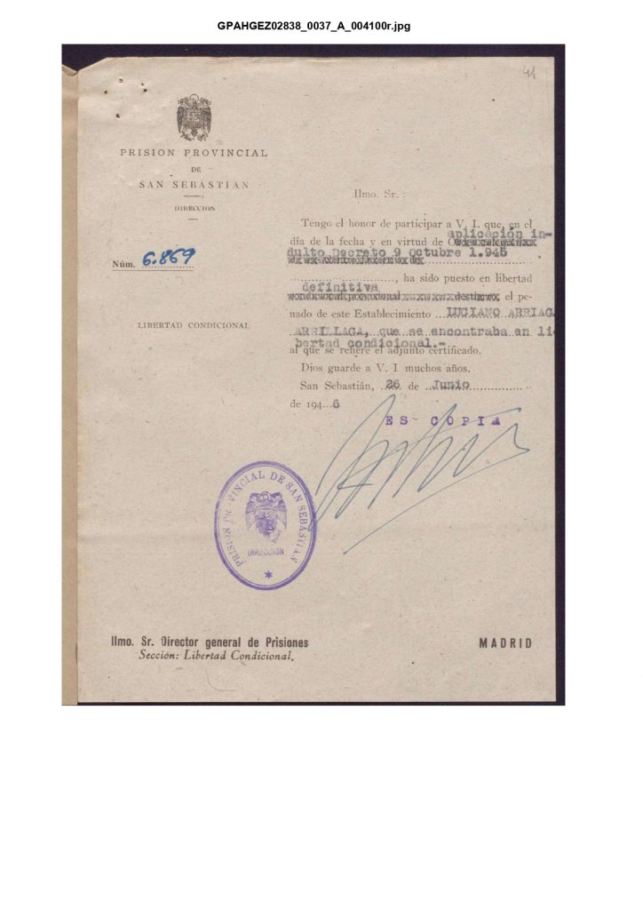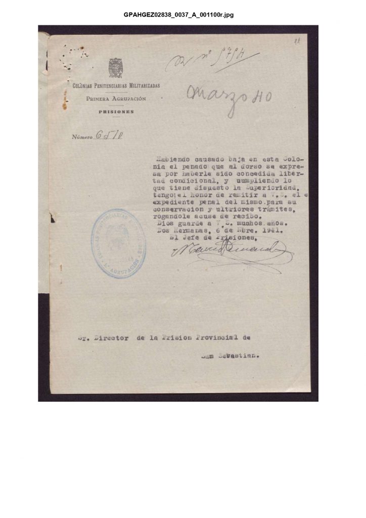 1941/11/06ean lortu zuen baldintzapeko askatasuna Sevillan. Baina Ondarretara eraman zuten berriz. Atxilotu eta bederatzi urtera, 1946/05/04ean, geratu zen erabat libre.
