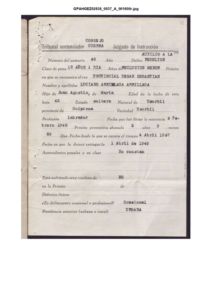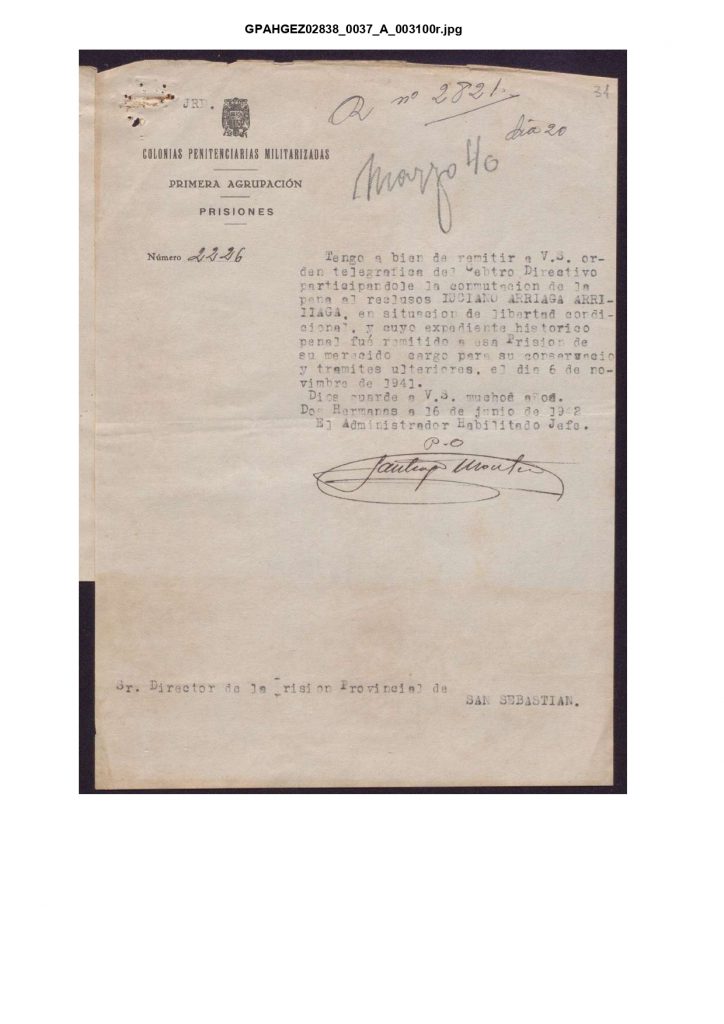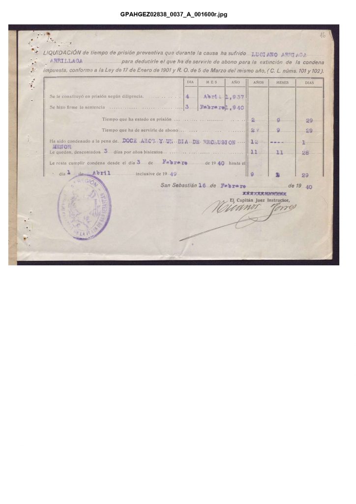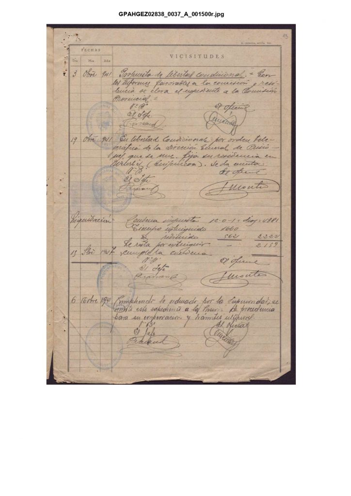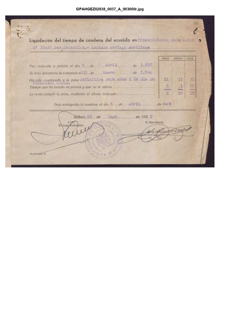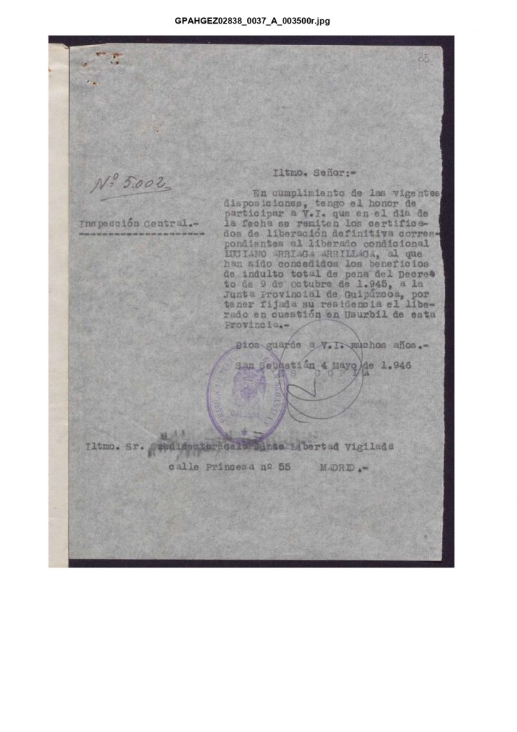 1941/11/06ean lortu zuen baldintzapeko askatasuna Sevillan. Baina Ondarretara eraman zuten berriz. Atxilotu eta bederatzi urtera, 1946/05/04ean, geratu zen erabat libre.