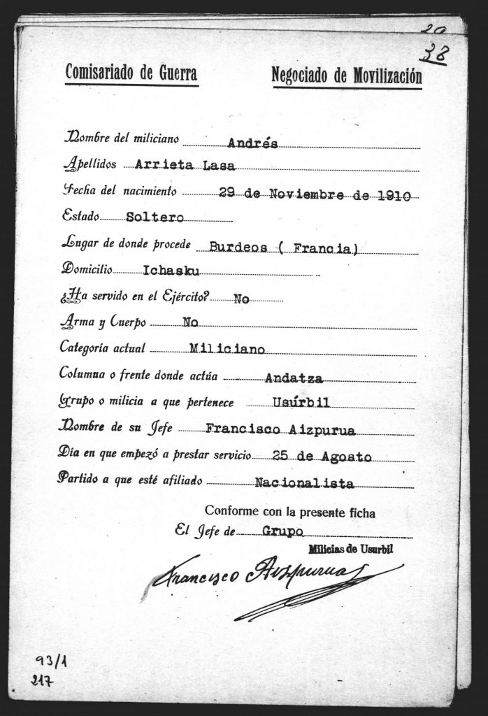 1910/11/29an jaioa Burdeosen, Itxaskue baserrian (Bulano) bizitakoa. Ezkongabea, nazionalista. 1936/08/25tik aurrera  Usurbilgo Gerra komisaldegiko 2. Eskuadrako milizianoa izan zen (F. Aizpurua buru).