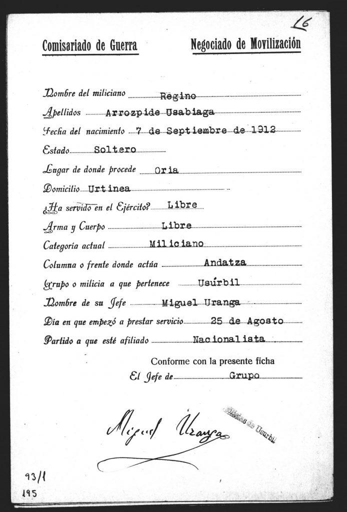 Ideia abertzaletakoa, 1936/08/25ean,  milizietan eman zuen izena, zehazki Usurbilgo Gerra komisaldegiko 3. Eskuadran (M. Uranga buru). Laster atxilotua izan zen beste usurbildar batzuekin, tartean Zabaleako Eustakio Aizpuruarekin eta gero erailko zuten bere anaia Patxirekin. Lasarteko kuartelean zeukatela, itzal handiko norbaiten eraginez aske utzi zuten. Berarekin batera Eustakio ere bai.