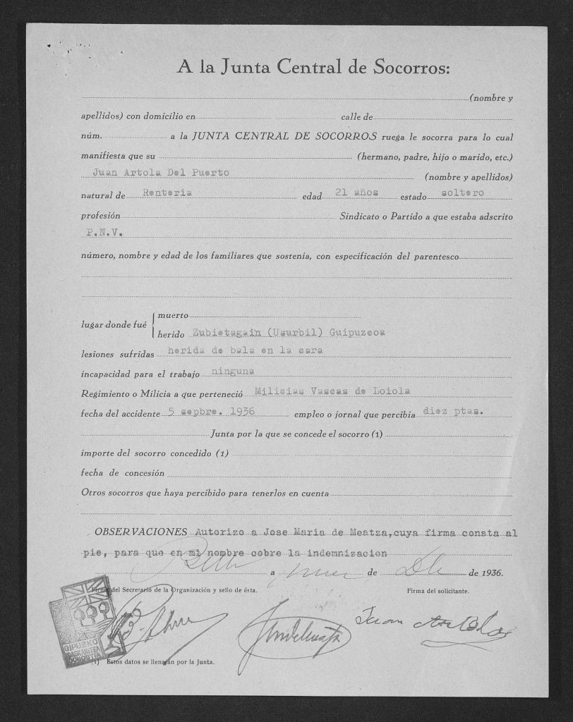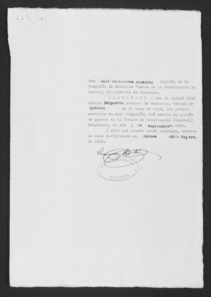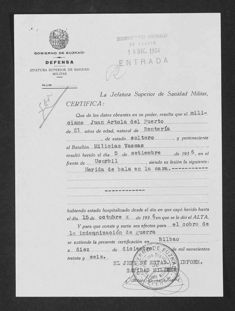 Zauritua izan zen Zubietagaingo frontean (Usurbil) 1936/09/05ean. Dorigako (Asturies) erietxera lekualdatu zuten 1937/05/16ean. Bidarten, (Lapurdi) La Roseraie Ilbarritzgo erietxean internatua zegoen 1937/12/31n.