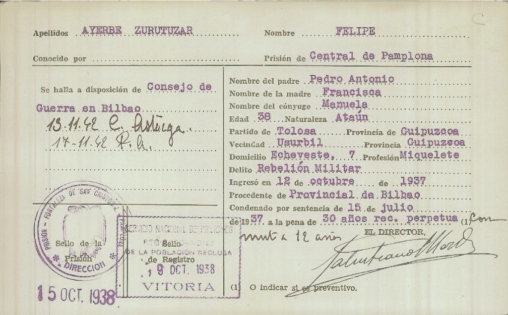 Kartzelan zela, 28 urteko bere anaia Bernardo Teruelgo frontean hil zen 1938ko urtarrilaren 6n, baina kolpisten alde. Erreketeen Oriamendi Tertzioko sargentoa zen.