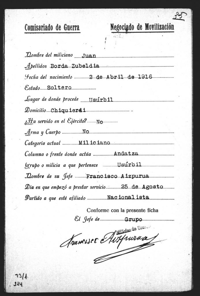 Usurbilen jaioa 1916/04/02an. Txkierdi auzoan bizi zen. Ezkongabea. EAJ-ko militantea. 1936/08/25tik aurrera Usurbilgo Gerra komisaldegiko 2. Eskuadrako milizianoa zen (F. Aizpurua buru).