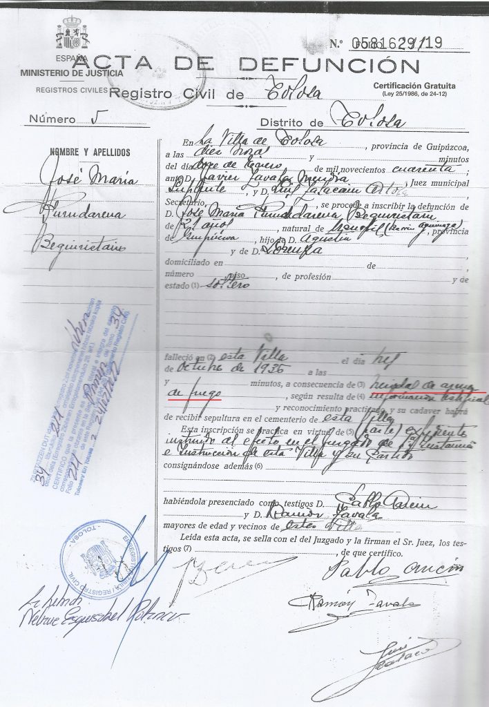 San Praxku jaietan bete-betean, familiarekin etxean zegoela, txapelgorriak [erreketeak] bila joan zitzaizkion eta, gerora, lagun batzuei esker jakin zuten Lasarteko koartelara eraman zutela eta 1936/10/03an, 21 urterekin, Tolosako hilerrian fusilatu zutela epairik gabe. Hamar urte geroago, familiak gorpua berreskuratzea lortu zuen eta Aginagako hilerrian lurperatu zuen.