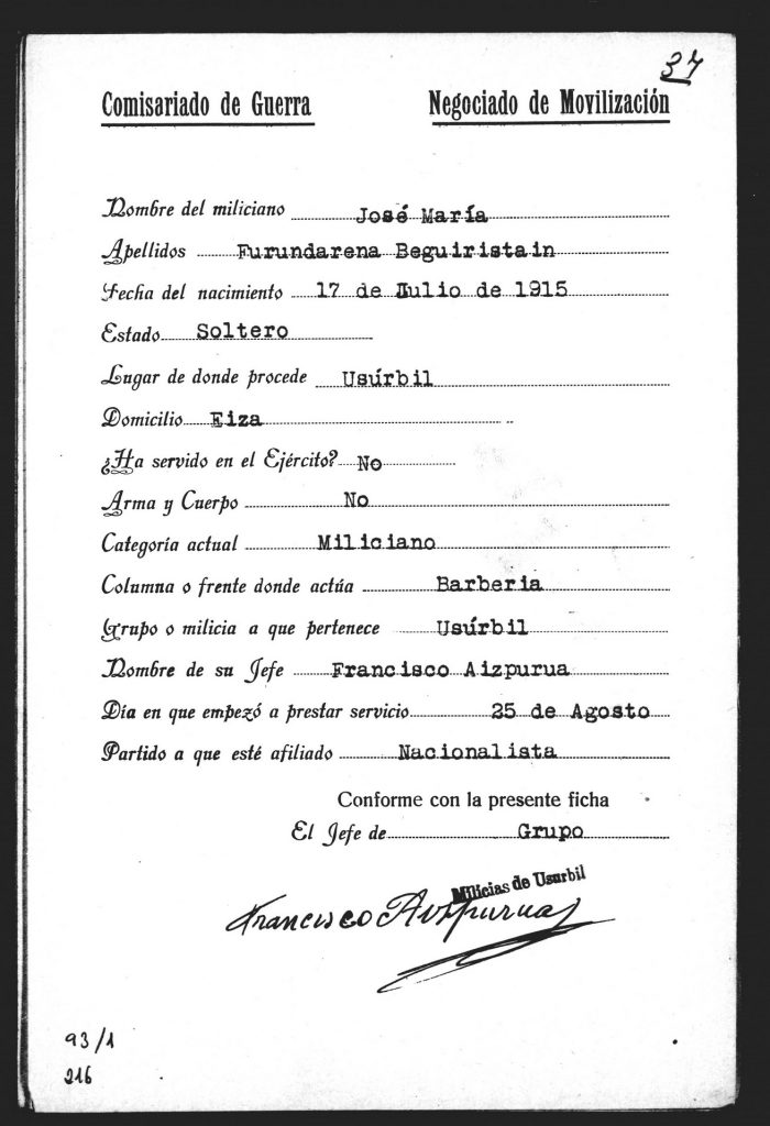 *Usurbilen jaio zen 1915/07/17an, Aginagako ‘Eiza’ baserrian bizi zen. Ezkongabea, pilotari afizionatua eta aitari barbero lanetan laguntzen ziona. EAJko kidea eta Usurbilgo milizietan mobilizatuta 1936/08/25an (F. Aizpurua buru zuen), hain zuzen, bizargile bezala. Usurbilgo Gerra komisaldegiko milizianoa zen. 2. Eskuadrakoa, eta, beste lagun usurbildarrekin batera, Saroe jauregian (garaian jeltzaleek koarteltzat hartutako markesaren etxea) goardiak egin zituen.