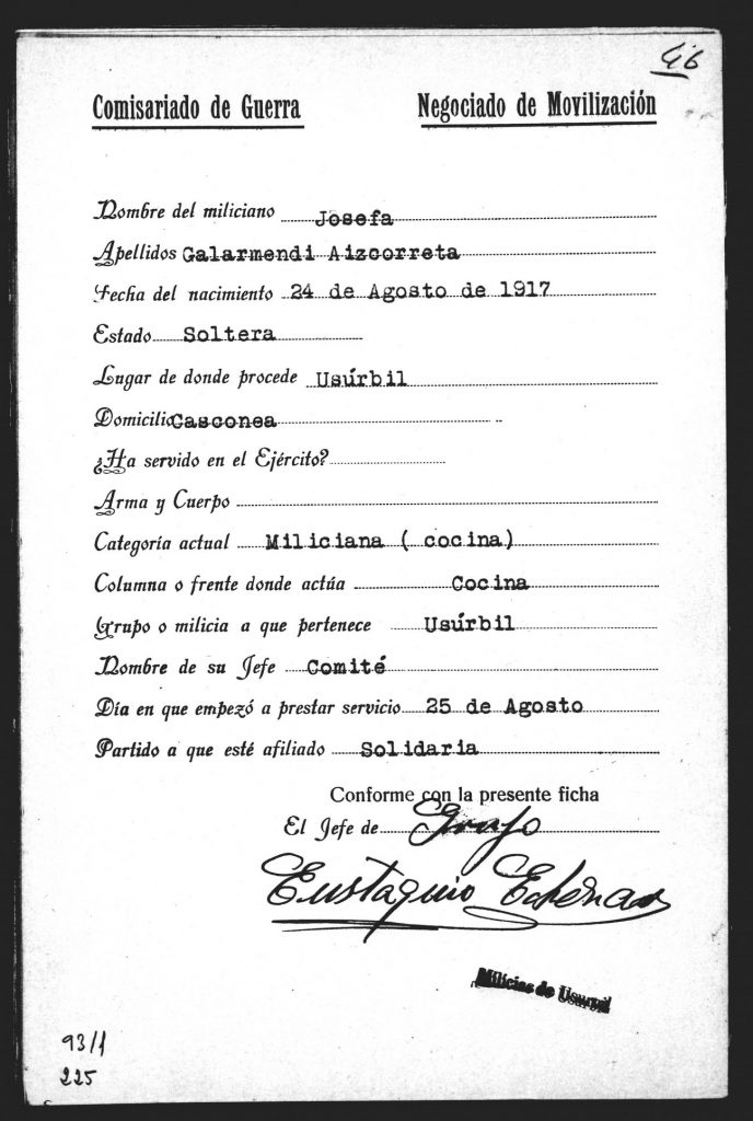*Usurbilen jaio zen 1917/08/24an. Kalezarreko Kaxkonean bizitakoa. Ezkongabea, ‘Solidaria’, hau da, SOV-STV sindikatuko kidea, eta SRI erakundeko kidea. Sukalde lanetan aritu zen 1936/08/25tik aurrera, Usurbilgo Gerra komisaldegiko miliziana gisa.