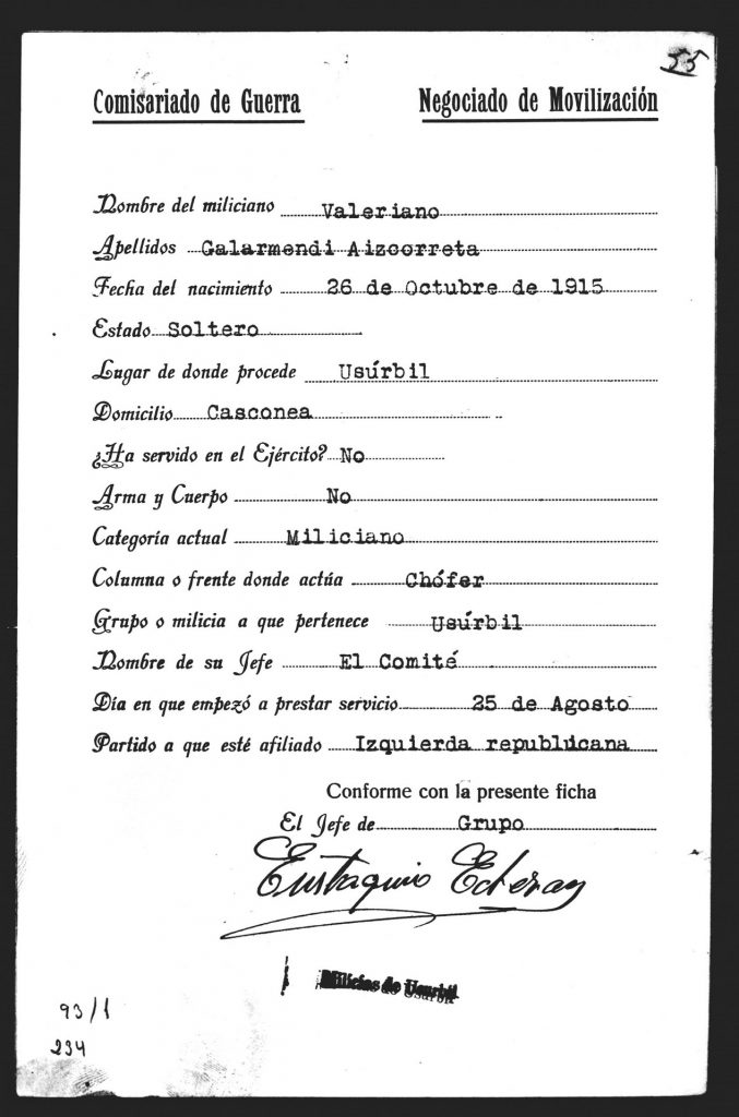 *Usurbilen jaiotakoa 1915/10/26an, eta Kalezarko ‘Kaxkoenea’ etxean bizitakoa. Ezkongabea, IR alderdiko eta JSU erakundeko kidea eta txofer lanetan 1936/08/25tik aurrera Usurbilgo milizietan, hain justu, Usurbilgo Gerra komisaldegiko milizianoa. 1936ko urrian eta abenduan, 1937ko urtarrileko 2. hamabostaldia eta otsaileko lehenengoan ‘MAOC-1 Larrañaga’ batailoiko miliziano gisa borrokan agertzen da. Euzko Gudarosteko ‘37134’ txapa zenbakia zuen. Horren ostean, ‘MAOC-2 Gipuzkoa’ batailoiko kide izana.