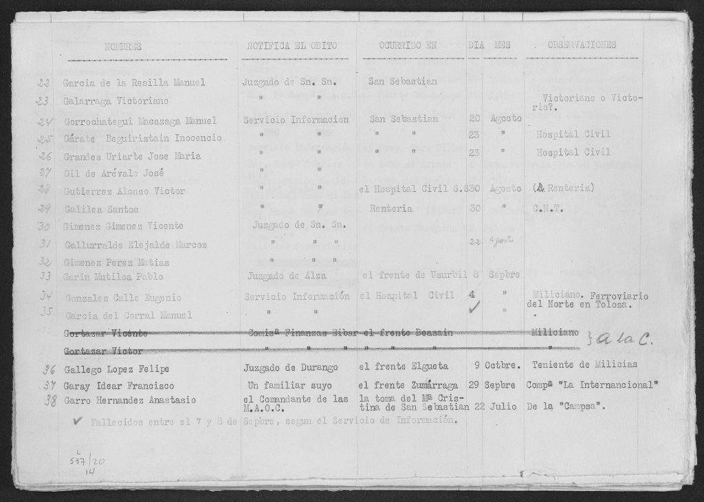 Artileriako soldadua. 1936/09/08an, Usurbilgo frontean metrailak eragindako zauri oso larrien ondorioz, segituan hil zen.