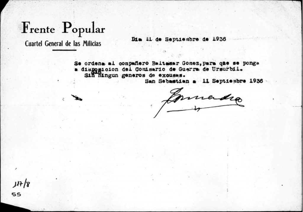 Milizianoa. 1936ko irailaren 11n Usurbilgo Gerra komisaldegiaren esanetara jartzeko agindu zioten.