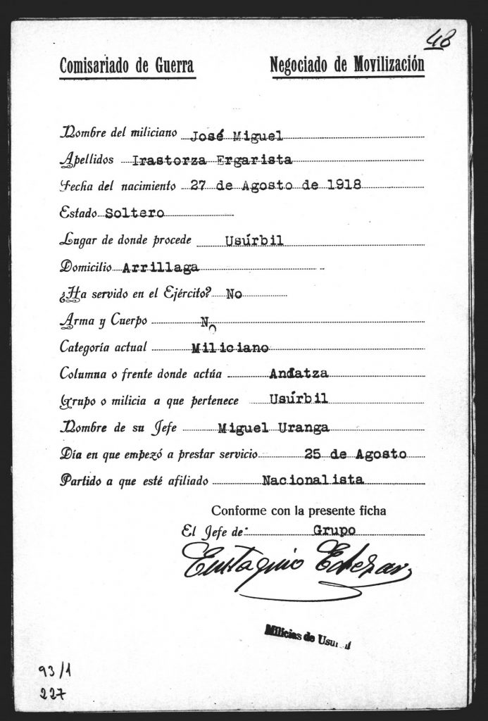 Usurbilen jaioa 1918/08/20an. Ezkongabea, nazionalista (PNV) eta 1936/08/25tik aurreraUsurbilgo Gerra komisaldegiko 3º eskuadrako milizianoa (M. Uranga buru). 1936/10/01 mobilizatua. 1936ko abendutik 1937ko apirila arte Itxarkundia batailoiko 4. konpainian zebilen errepublikaren alde borrokan.