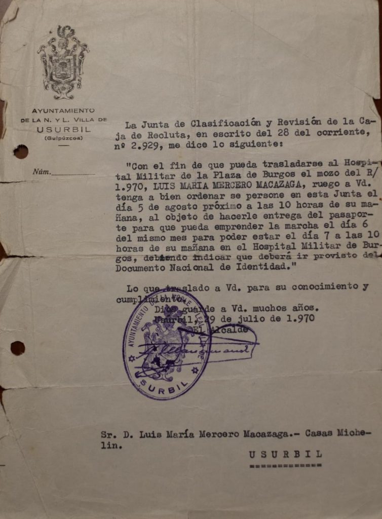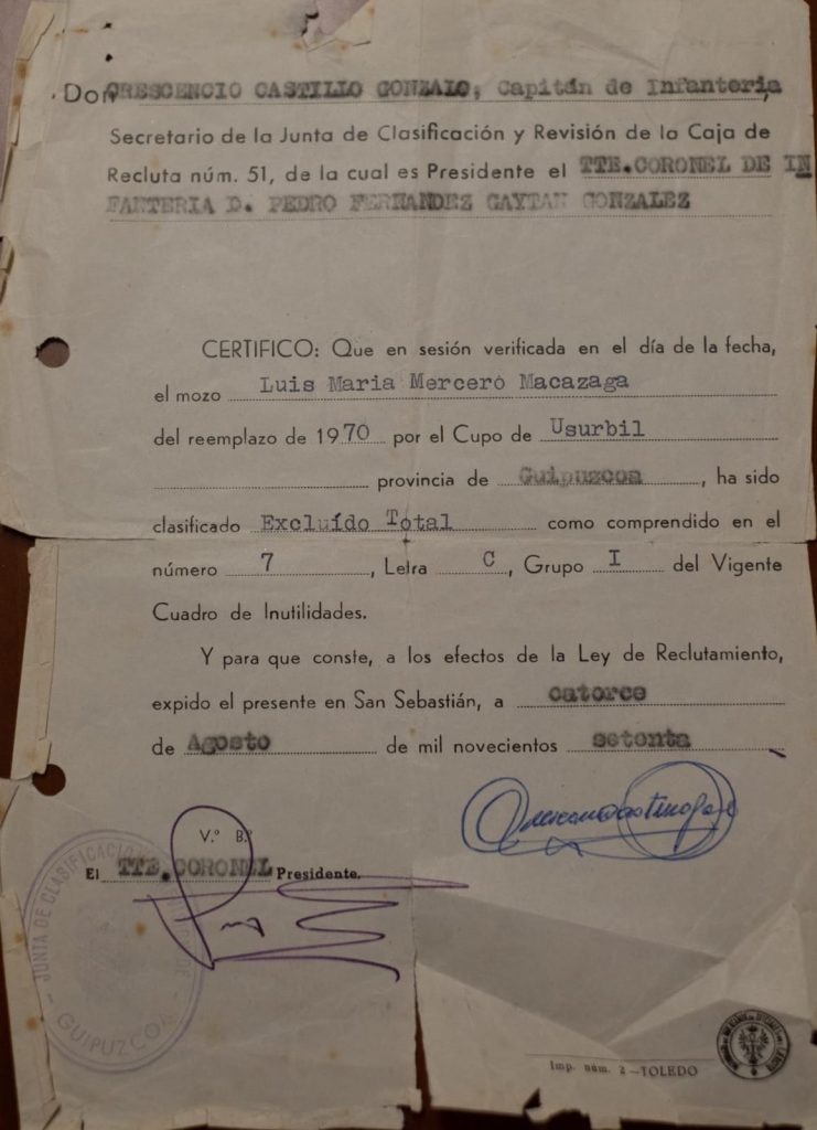 Izan ere, Erregimen frankistaren menpeko administrazioak Luis Mariren gaixotasunaren berri izan, bazuen. Baina familia “markatu” batekoa zenez, behin eta berriz bidaltzen zioten soldaduskara joateako deialdia. Luis Mariren ezintasuna medio, familiak entzungor egiten zien deialdi guztiei.