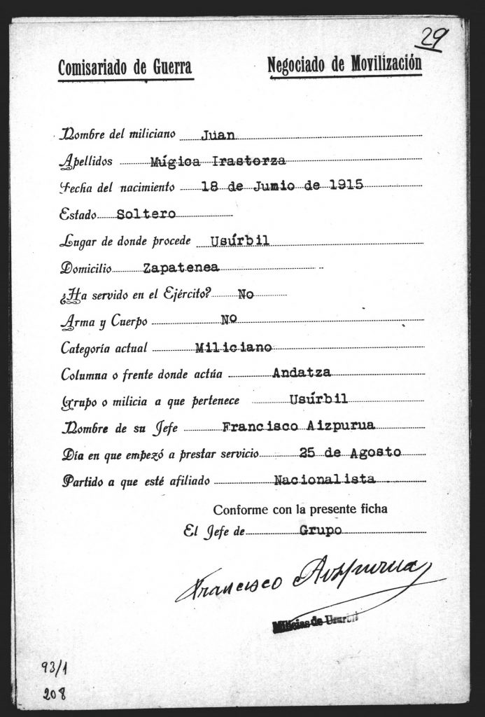 *Usurbilen jaiotakoa 1915/06/18an, Kalezarko Zapatarienean bizitakoa. Ezkongabea eta nazionalista. Usurbilgo Gerra komisaldegiko 2.eskuadrako milizianoa zen 1936/08/25etik aurrera (F. Aizpurua buru). Urte bereko urrian ‘MAOC-1. Larrañaga’ batailoiko kide egin zen. Euzko Gudarosteko 28.026 txapa zenbakia zuen.