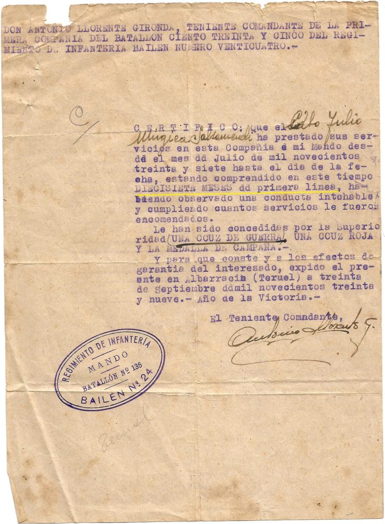 Alazne Begiristainek 1995ean egin zion elkarrizketan aipatzen du, soldadutza denbora guztian, soilik 10 eguneko bi permiso izan zituela,  gorriak eta bi ikusi zituela, hildako asko, eta lurrean etzanda babesten zirela frontean.