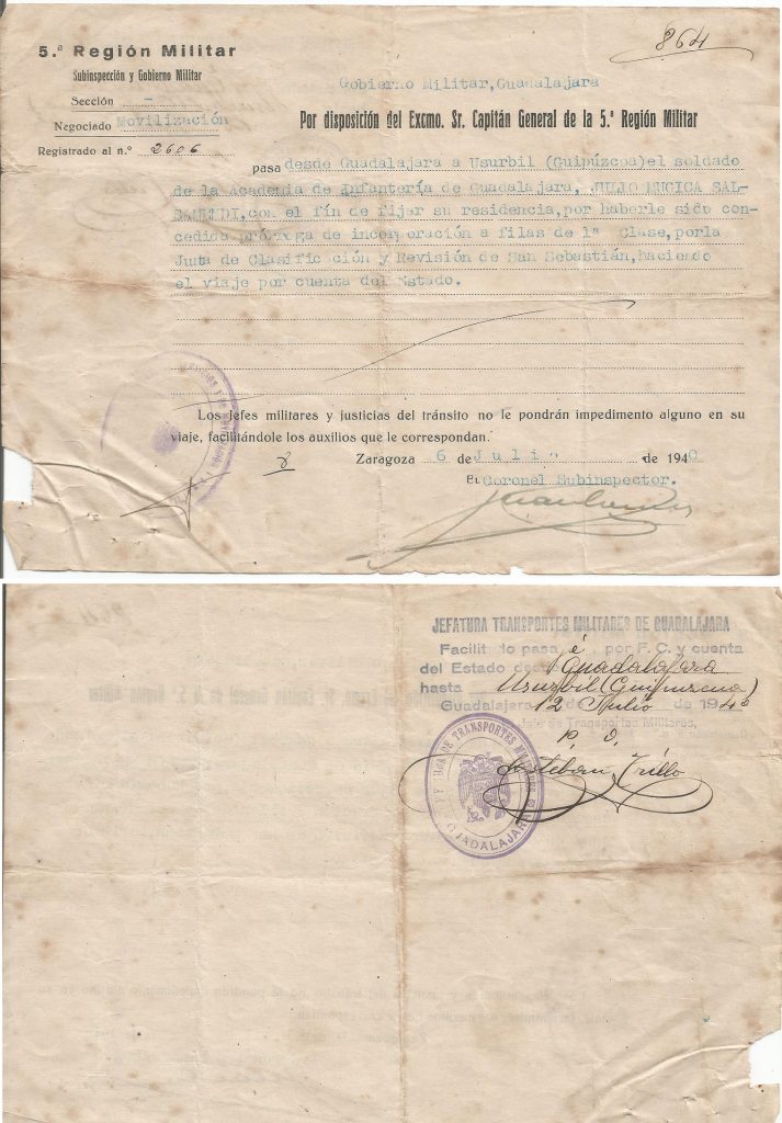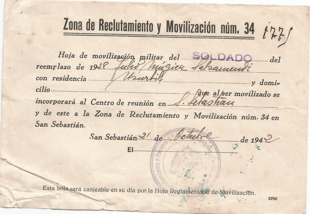 1937an kolpistek gerrara eraman zuten soldadu Logroñoko Bailen 24 Infanteriako erregimenduan, eta baita Teruelen, Gironan eta Guadalajaran ere. Fronteko lehen lerroan 17 hilabetez egon zen. 1940ko uztailean lizentziatu zuten prorroga emanda. 1942an Donostiako erreklutamendu eremuan mobilizatu zuten. Erreserban egon zen 1955 arte.