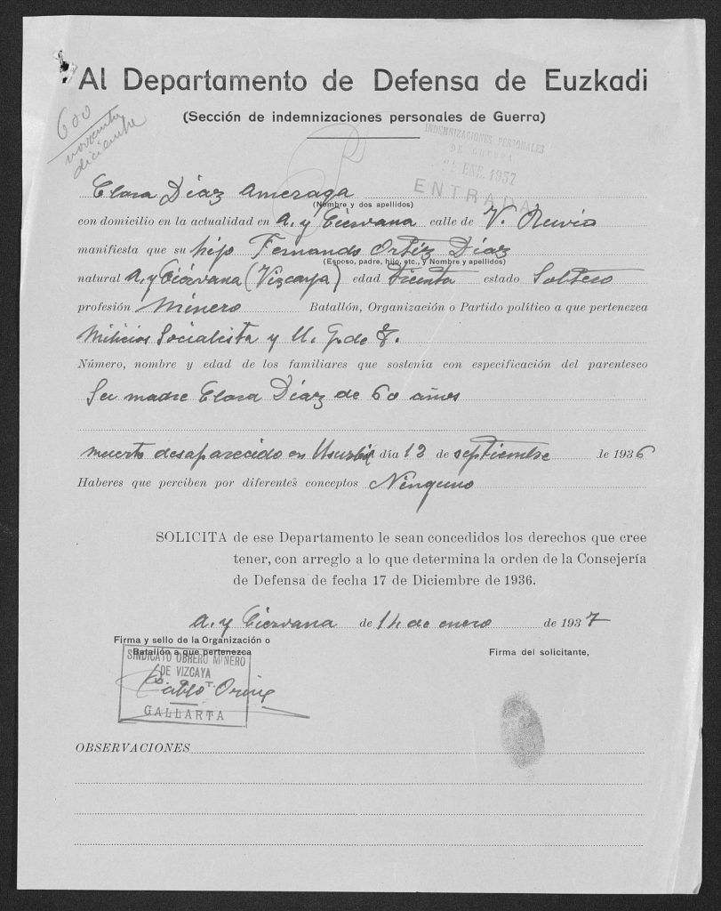 Abanto-Zierbenan jaioa eta bertan bizitakoa. Meatzaria. Ezkongabea. UGT-ko kidea eta milizia sozialistan erroldatua 1936/09/07an. Bi egun geroago Gipuzkoako frontera mobilizatua izan zen eta Usurbilgo frontean hil zen 1936/09/12an, 30 urterekin.