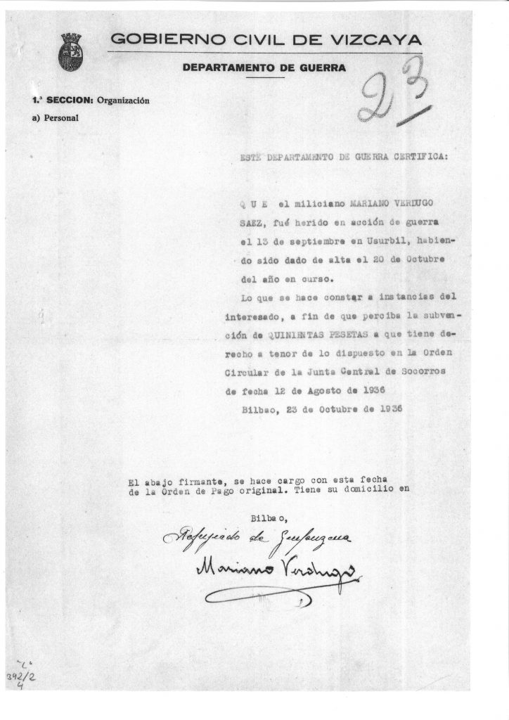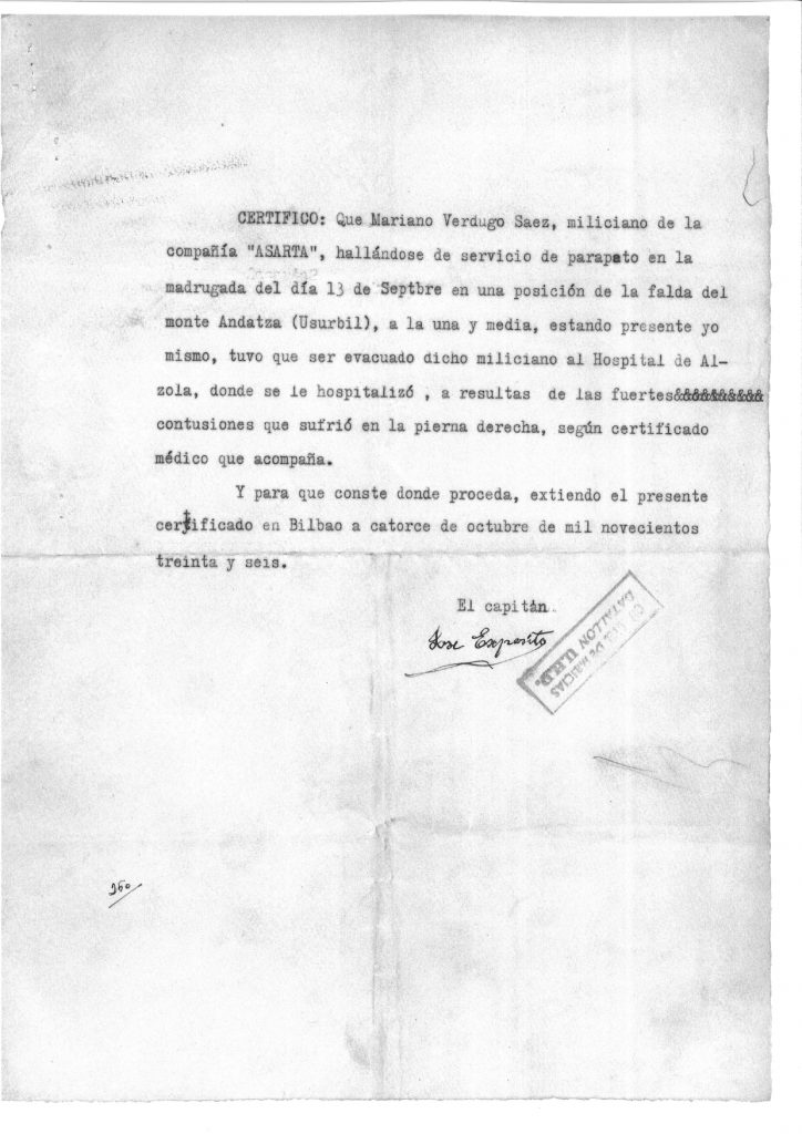 Union de Hermanos Proletarios (UHP) Batailoiko Asarta konpainiako milizianoa. 1936/09/13ko gaupartean zauritua izan zen Andatzako magaleko parapeto batean. Altzolako ospitalera eramana izan zen eta alta jaso zuen Bizkaiko ospitaleren batean 1936/10/20ean