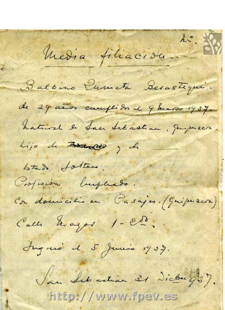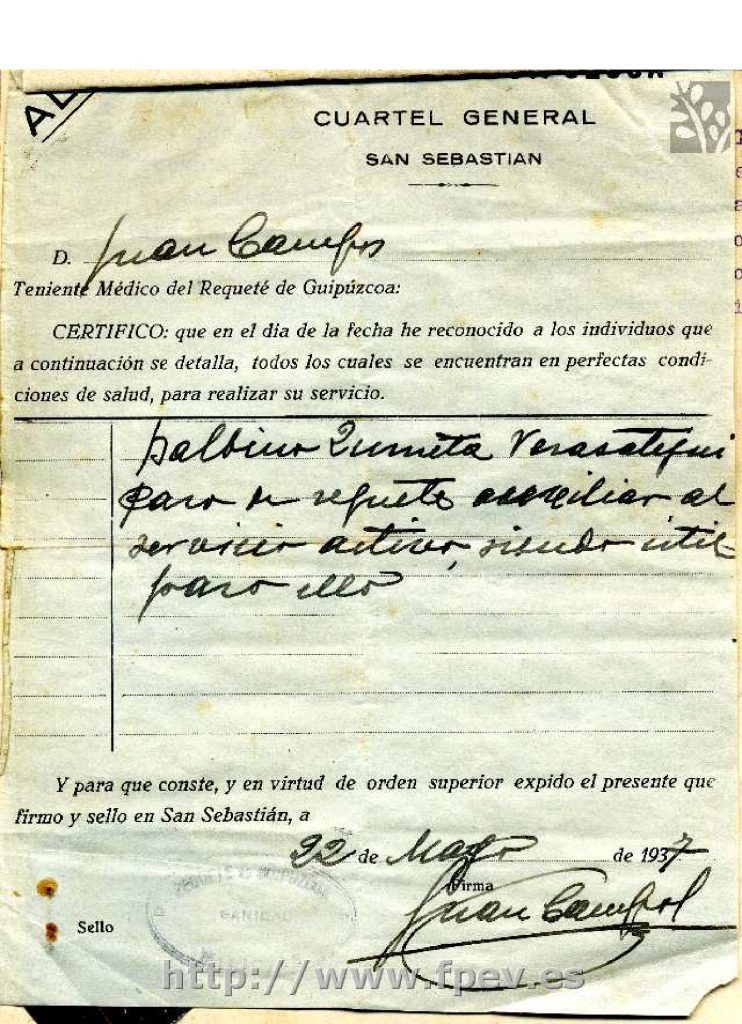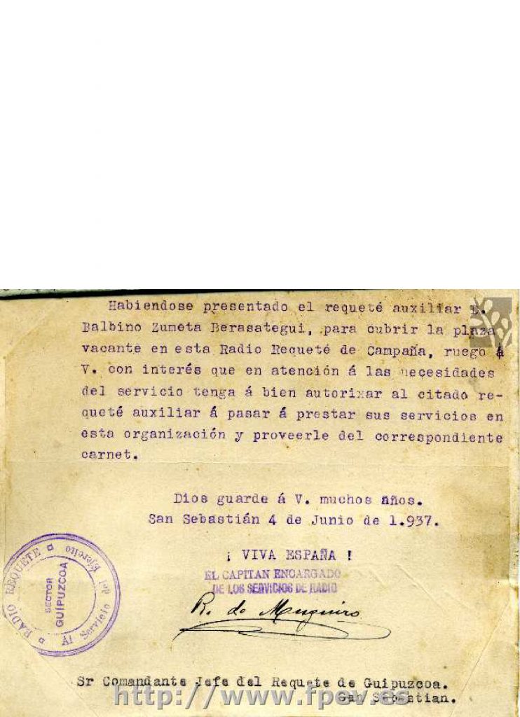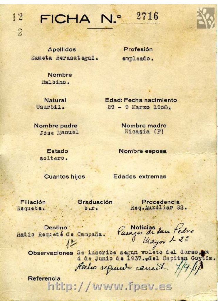 *Usurbilen jaio zen 1908/03/09an. Pasaian bizi zela, 1937/06/04an izena eman zuen Gipuzkoako Erreketeetan, Goitia kapitainak aurkeztuta. ‘Radio Requeté de Campaña’ delakoan mobilizatu zuten.